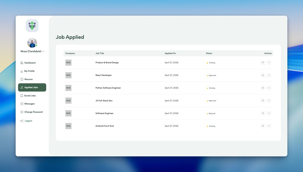 Track all your job applications in one place, monitor their status such as pending, approved, or rejected, and review your application history to stay organized and follow up on opportunities effectively.